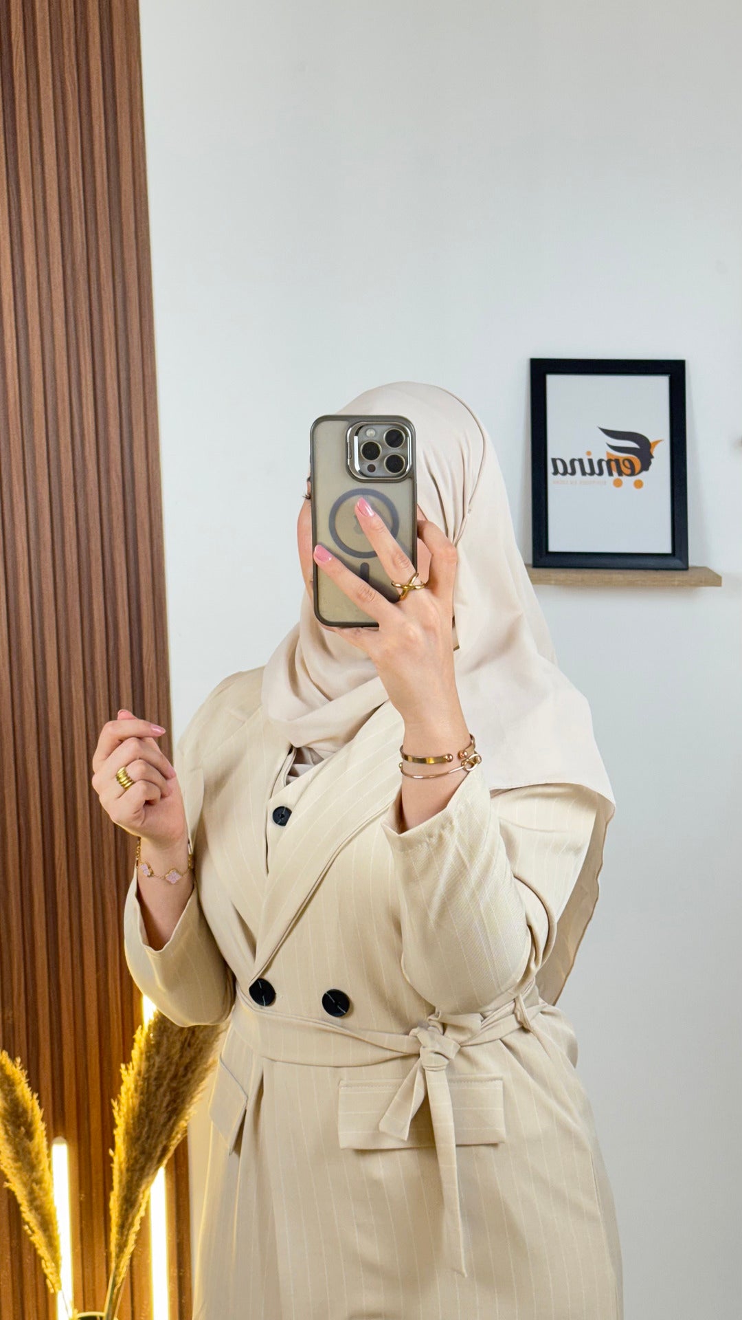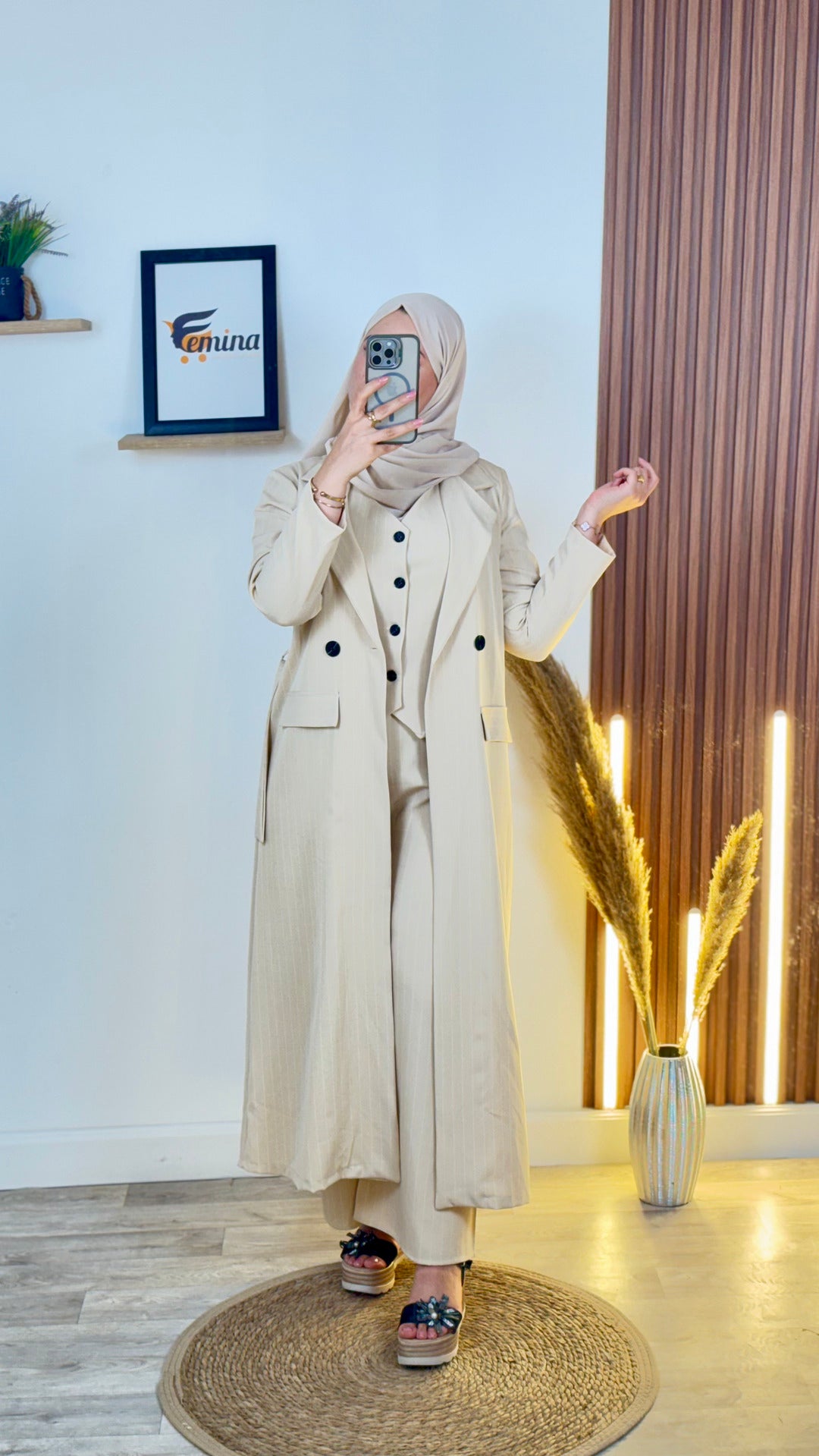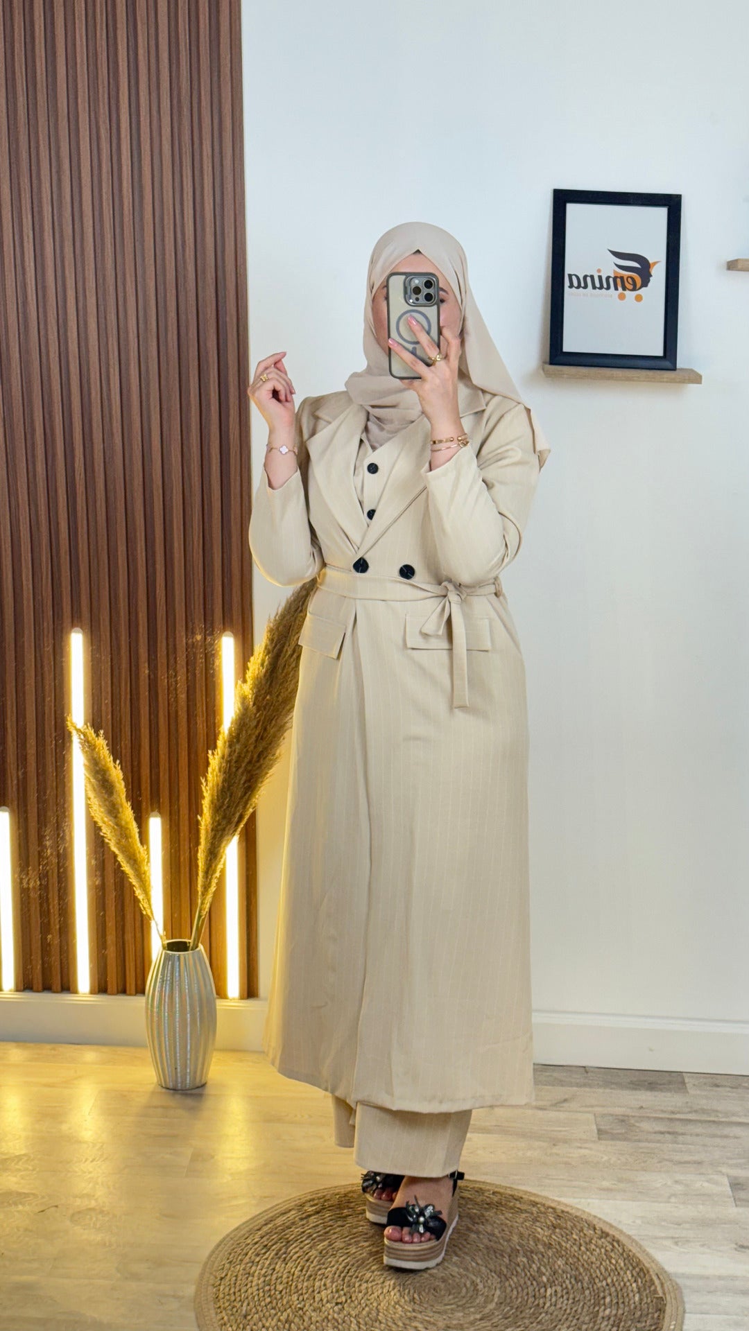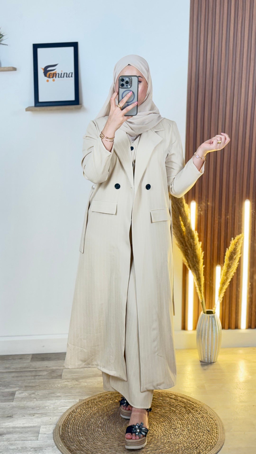 روب مونتو طويل محتشم و متناسق مع الجيلي و السروال، باش يعطيك إطلالة مرتبة ومريحة طول النهار.